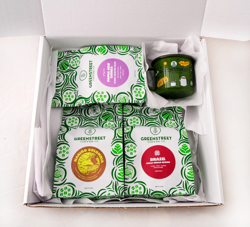 The Ultimate Gift Box comes with 3 craft roasted specialty coffees chosen by the team and an enamelware mug from your neighborhood coffee roaster. Make your loved ones feel the warmth of the season with this coffee box.